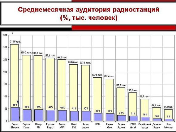 Исследовательская компания «Социс» в очередной раз (уже 5-й год) провела социологические исследования по радиостанциям Барнаула. Согласно опросу жителей города, пятерка лидеров по объему среднемесячной накопленной аудитории в тыс.чел. в 2009 году выглядит так: