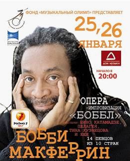 Роберт «Бобби» Макферрин младший - американский джазовый певец и дирижёр, десятикратный лауреат премии «Грэмми». В 1988 его прославила песня «Don't Worry, Be Happy". Уникальность оперы «Боббл», впервые представленной в 2008 году - то, что в ней нет словесного либретто или заранее подготовленных вокальных партий. Каждое представление - уникальная импровизация, результат совместной работы Бобби Макферрина и 17 вокалистов (среди которых - Нино Катамадзе и Пелагея). В основе оперы лежит история Вавилонской башни.