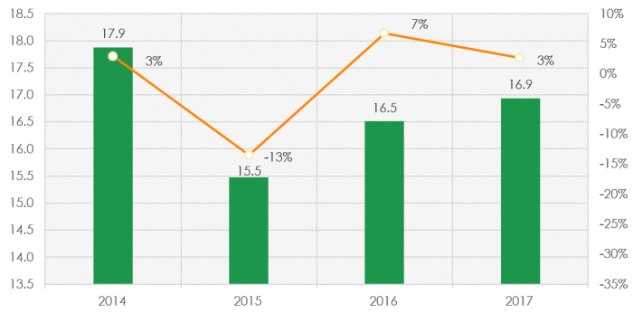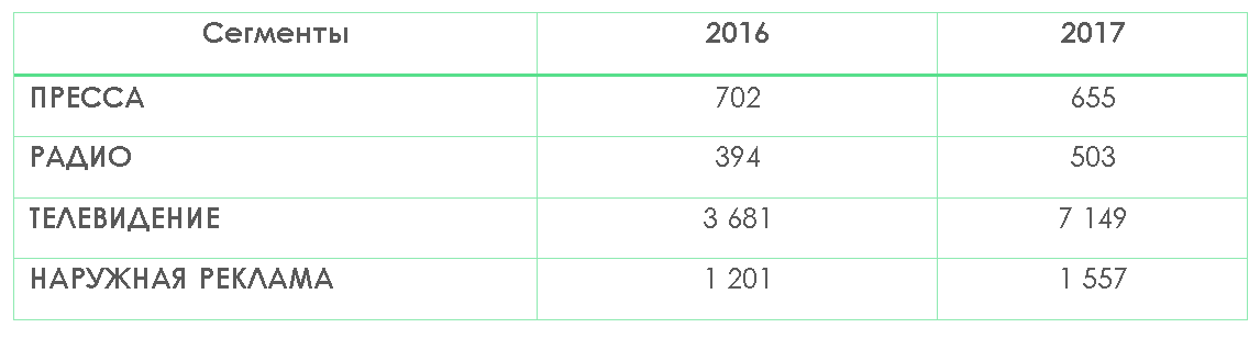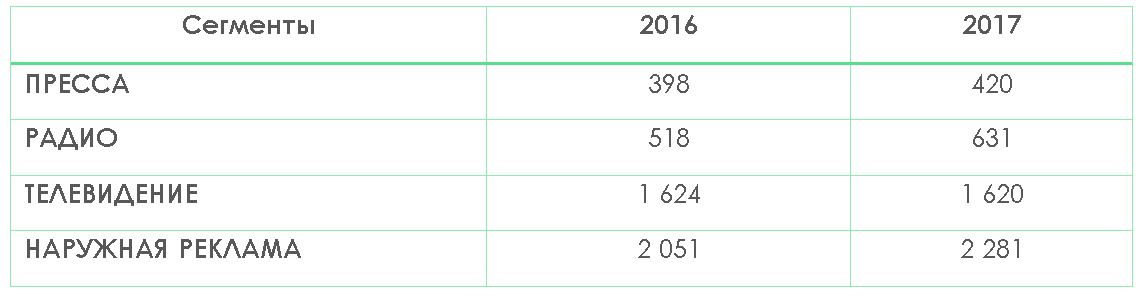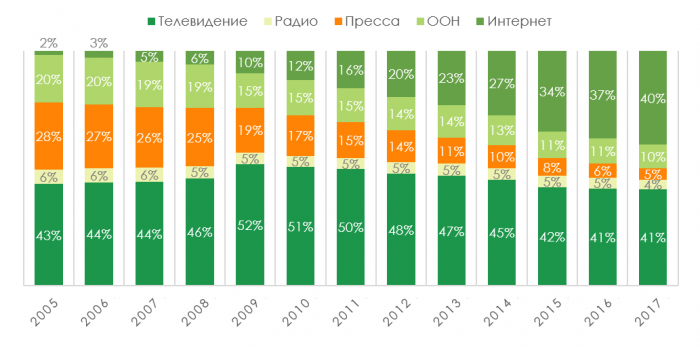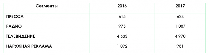 По итогам года объем всего рекламного рынка страны составил 417 млрд рублей, что выше прошлогоднего показателя на 14%. Основные тенденции 2016 года получили свое продолжение и в 2017 году, где абсолютными лидерами рынка являются телевидение и интернет. Примечательно, что в 2016 году на эти два медиа приходилось порядка 78%, в прошедшем же периоде, их совокупная доля рекламных бюджетов превысила отметку в 80%. Получается, что на оставшиеся три медиасегмента (радио, печатные СМИ, ООН) приходится меньше 1/5 рынка.