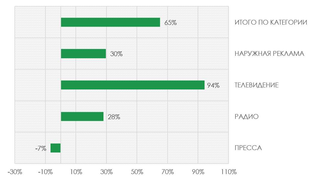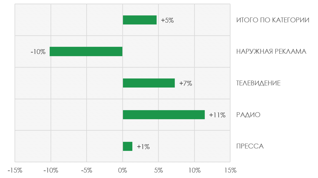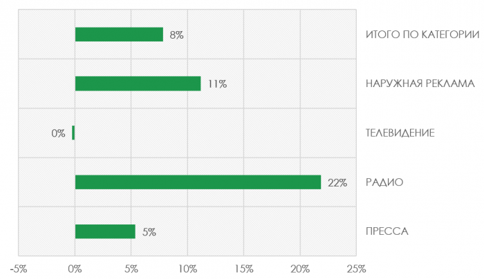 Следует также отметить, что отрицательную динамику, среди прочих, показали такие крупные для сегмента радио категории, как «Недвижимость» и «Медицина и фармацевтика». Падение бюджетов к прошлому году составило -10% и -% соответственно.