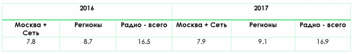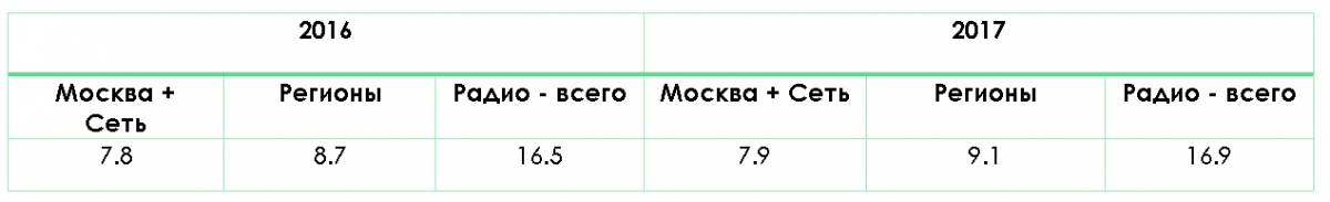 Как следует из таблицы и вышесказанного, объем рекламных затрат в сегменте радио увеличился почти на 3%. Если же принять во внимание величину инфляции (в 2017 году она составила 2,5%), то заявленный рост бюджетов в сопоставимых ценах почти целиком сходит на нет.