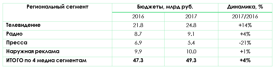 Тем не менее положительной динамикой в течение года отметились первый (+8%) и последний кварталы (+4%). При этом региональный подсегмент радио ощущал себя значительно лучше. Бюджеты региональной составляющей радиорекламного рынка выросли на 4% по сравнению с 2016 годом. Таким образом, на региональном рынке по динамике радио занимает вторую позицию после телевидения, а по объемам вплотную приблизилось к наружке.