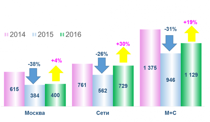Однако динамика для Москвы и сетей оказалась весьма разной. Можно с уверенностью сказать, что драйвером роста оказался именно сегмент сетевого размещения.