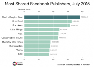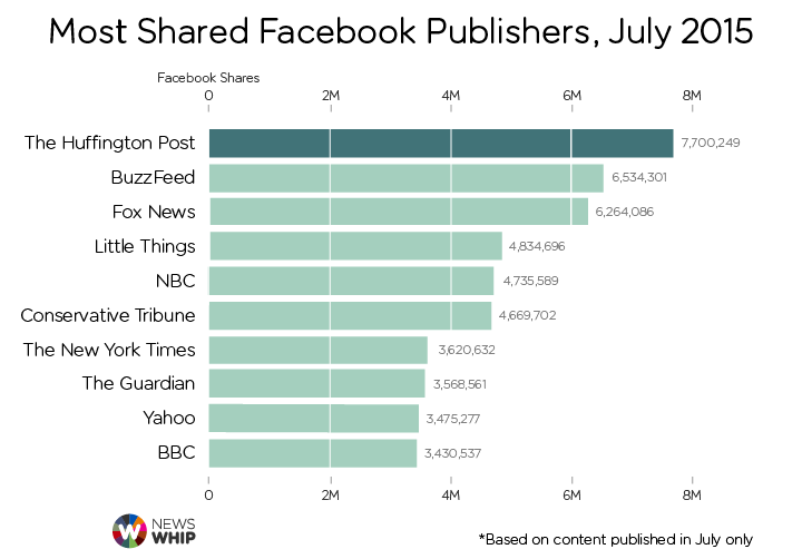 Первичным показателем при составлении списка является количество расшаров, собранных опубликованным в соцсети материалом. Лидером, как и в предыдущем месяце, является The Huffington Post, чьи материалы были расшарены около 7,7 миллиона раз (в июне этот показатель составлял около 7,6 миллиона). Второе место занимает BuzzFeed, находившийся на той же позиции и в прошлом отчетном периоде.