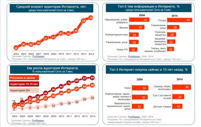 Пользование интернетом осталось по-прежнему характерным для жителей городов-миллионников, россиян с высшим образованием или ученой степенью, квалифицированных специалистов и занятых на руководящих постах. При этом 2014 г. возрастные рамки расширились до 44 лет (в 2004 г. пользование Интернетом было характерно для людей в возрасте 10-34 лет), а мужчины и женщины стали практически одинаково представлены в Сети (ранее для мужчин присутствие онлайн было более характерно, чем для женщин).